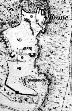 leicht nach außen gebogener Graben und Wall in Ost-West-Richtung die erste Vorburg vom Bergplateau abtrennt. Er ist durch eine Schildmauer bebaut,